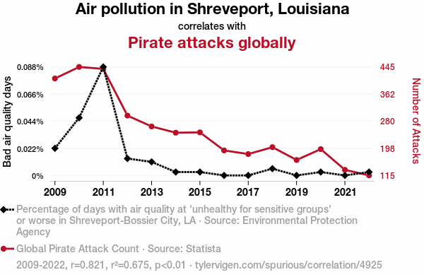 A linear line chart with years as the X-axis and two variables on the Y-axis. The first variable is Air pollution in Shreveport, Louisiana and the second variable is Pirate attacks globally.  The chart goes from 2009 to 2022, and the two variables track closely in value over that time. Small Image