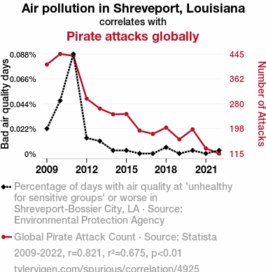 Now, before you start drawing conclusions as wild as a pirate's tales, remember, correlation does not imply causation—unless, of course, we're discussing the correlation between a pirate's penchant for buried treasure and their penchant for high-seas adventure! It seems, in this case, that the "clear air" in Shreveport may be causing a surge in seafaring shenanigans. But as we all know, jumping to conclusions can be as risky as walking the plank!