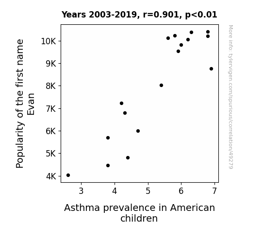 A linear line chart with years as the X-axis and two variables on the Y-axis. The first variable is Popularity of the first name Evan and the second variable is Asthma prevalence in American children.  The chart goes from 2003 to 2019, and the two variables track closely in value over that time. Small Image