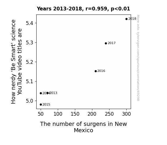 This means 91.9% of the change in the one variable (i.e., The number of surgens in New Mexico) is predictable based on the change in the other (i.e., How nerdy 'Be Smart' science YouTube video titles are) over the 6 years from 2013 through 2018.