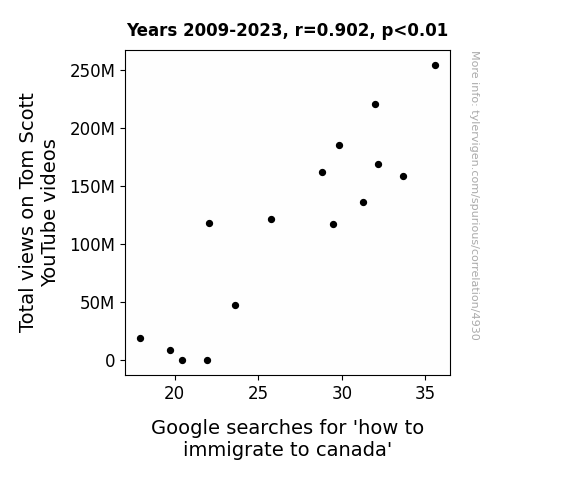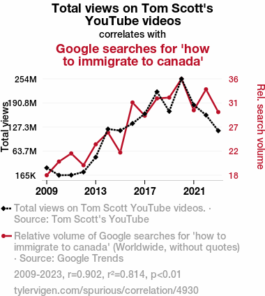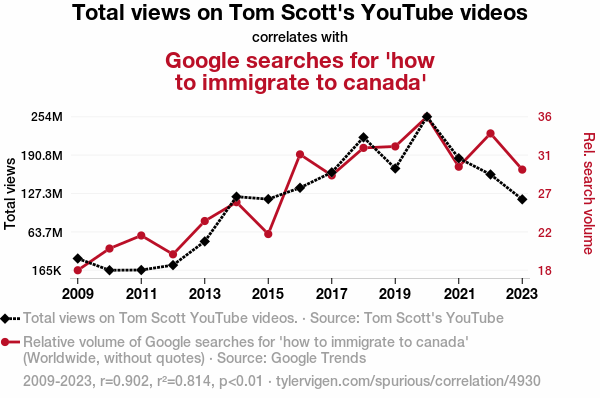 User prompt: Please make up a funny explanation for how an increase in Total views on Tom Scott YouTube videos caused how to immigrate to canada (Google searches for 'how to immigrate to canada') to increase. Make it feel plausible.