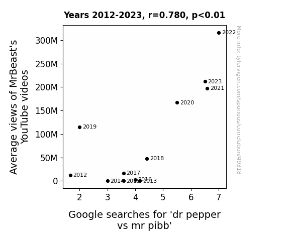 This means 60.8% of the change in the one variable (i.e., Google searches for 'dr pepper vs mr pibb') is predictable based on the change in the other (i.e., Average views of MrBeast's YouTube videos) over the 12 years from 2012 through 2023.
