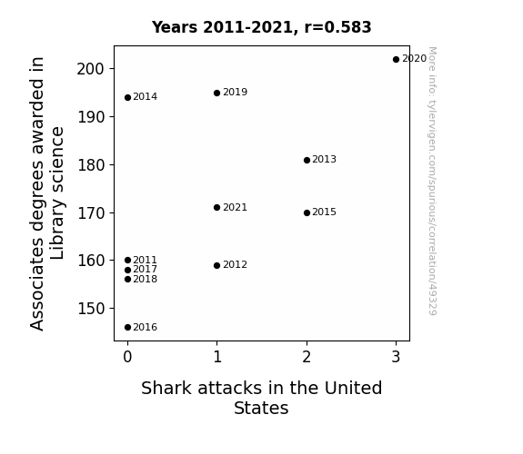 This means 34% of the change in the one variable (i.e., Shark attacks in the United States) is predictable based on the change in the other (i.e., Associates degrees awarded in Library science) over the 11 years from 2011 through 2021.