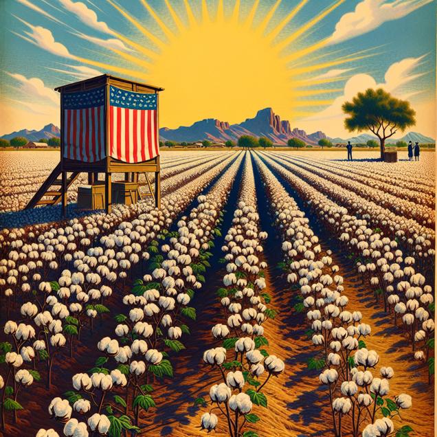 User prompt: Please describe a visual scene that prominently depicts both GMO use in cotton and Votes for the Republican Presidential candidate in Arizona, in the following situation: Farmers were too busy marveling at the resurgence of non-GMO cotton and didn't have time to engage in political discussions or attend rallies. The lack of genetically modified drama in the fields led to a decrease in conservative leaning cotton plants, resulting in an overall shift in the political landscape. It seems like these cotton fields were not just producing fabric, but also political preferences!. Keep the description simple.