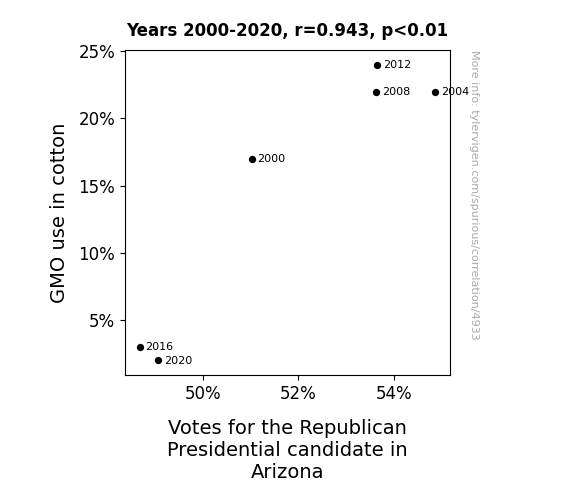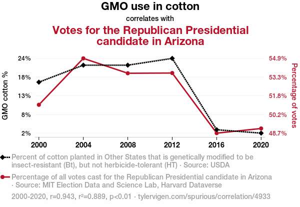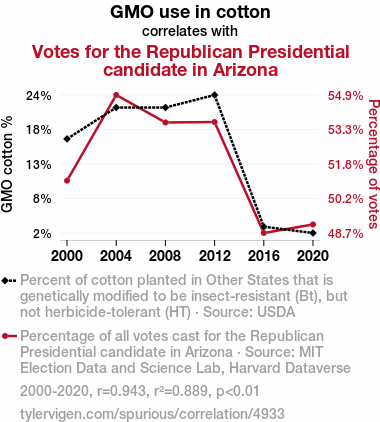 - The spurious research paper: Genetically Modified Oh-Cotton-Pickin' Politics: Analyzing the Relationship Between GMO Cotton Usage and Republican Presidential Votes in Arizona