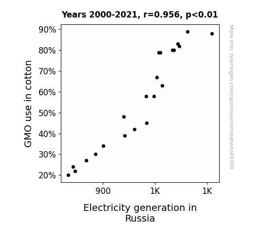 This means 91.4% of the change in the one variable (i.e., Electricity generation in Russia) is predictable based on the change in the other (i.e., GMO use in cotton) over the 22 years from 2000 through 2021.