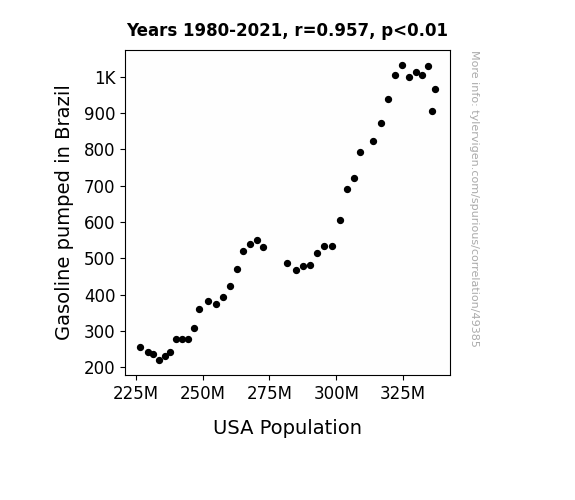 This means 91.6% of the change in the one variable (i.e., USA Population) is predictable based on the change in the other (i.e., Gasoline pumped in Brazil) over the 42 years from 1980 through 2021.