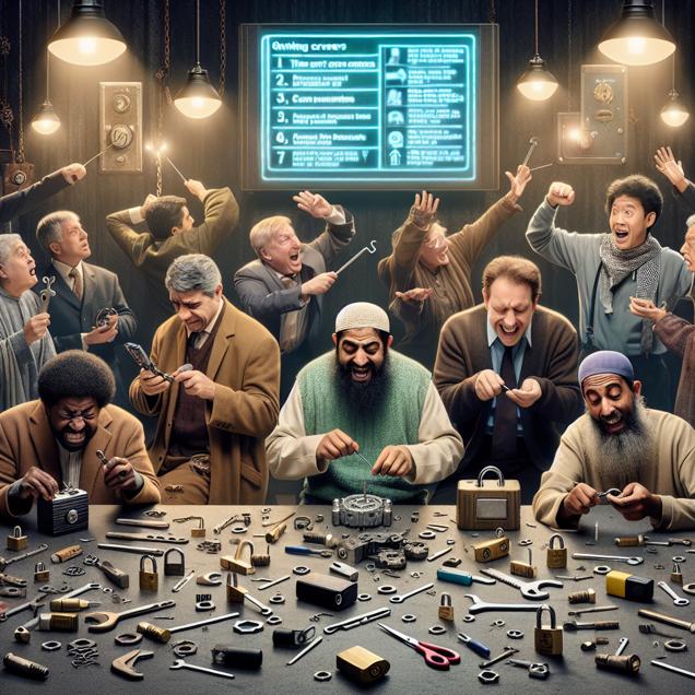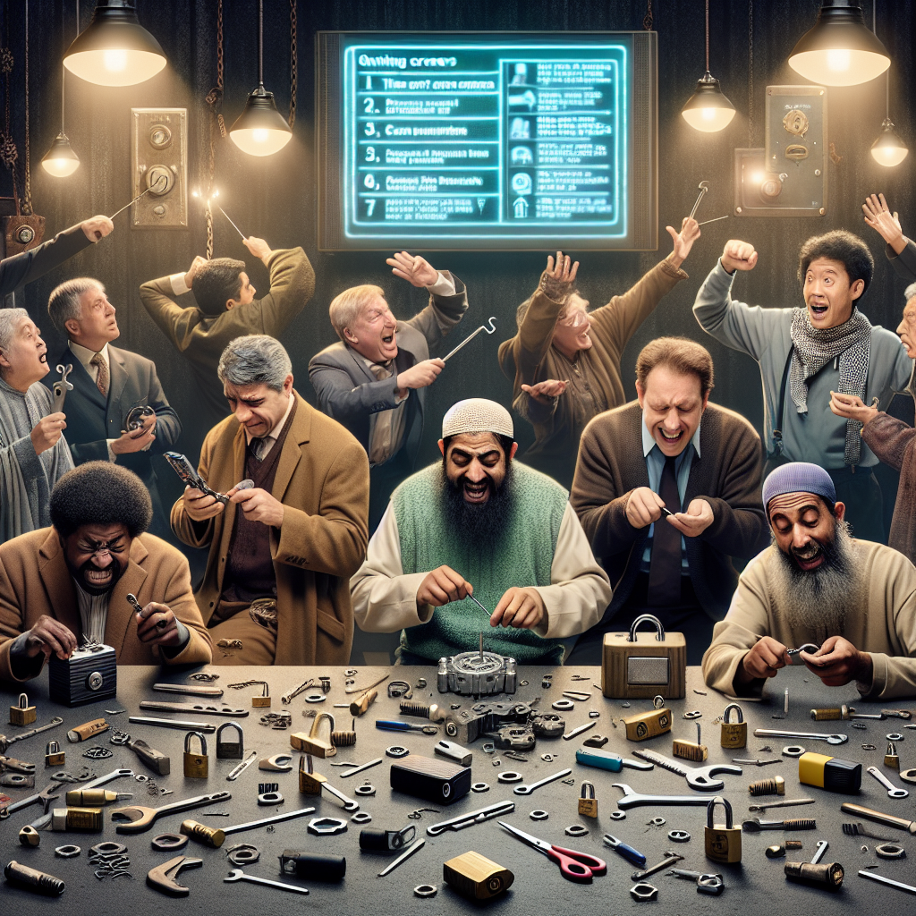 Prompt: Sure, here's an image generation prompt for DALL-E 3: Visual Prompt: In a small Kansas town, a group of burglars is shown gathered around a table in a dimly lit room. They are depicted scratching their heads in frustration with their usual tools and techniques scattered about. The locks they're attempting to pick are shown to be resolutely closed. In the background, a TV displays a series of LockPickingLawyer YouTube video titles with increasingly insightful and clever solutions. The burglars are depicted as frustrated by their lack of success and are eventually shown putting down their tools. They are then illustrated as grabbing stacks of brochures, excitedly discussing plans to pursue new careers as door-to-door salespeople, where their persuasive skills might hold more promise. This visual should capture the surreptitious yet humorous scene, incorporating details like the burglars' expressions of frustration and excitement, the scattered tools, and the TV displaying the LockPickingLawyer videos in a realistic and intriguing manner. The depiction should include only scenes, people, and objects, it should not include text or speech bubbles.