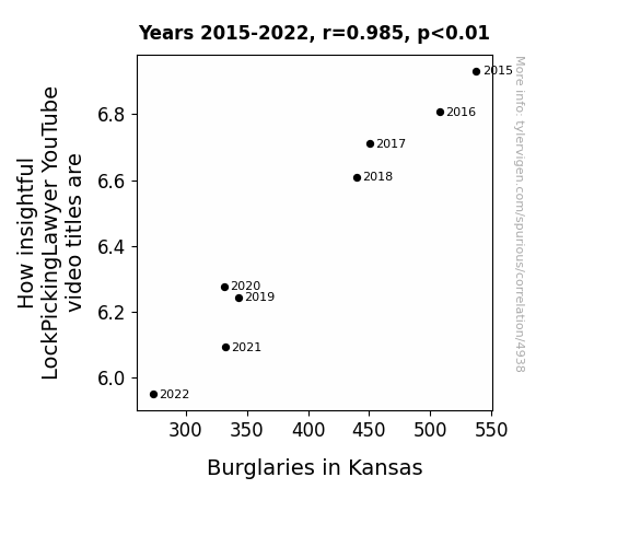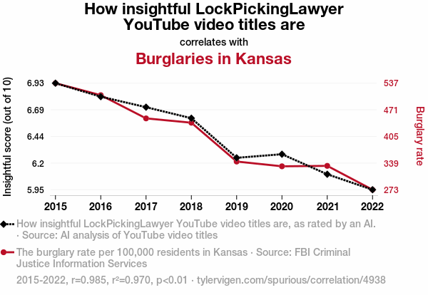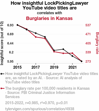 User prompt: Please make up a funny explanation for how a decrease in How insightful LockPickingLawyer YouTube video titles are caused Burglaries in Kansas to decrease. Make it feel plausible.