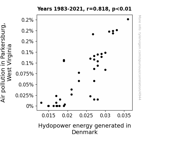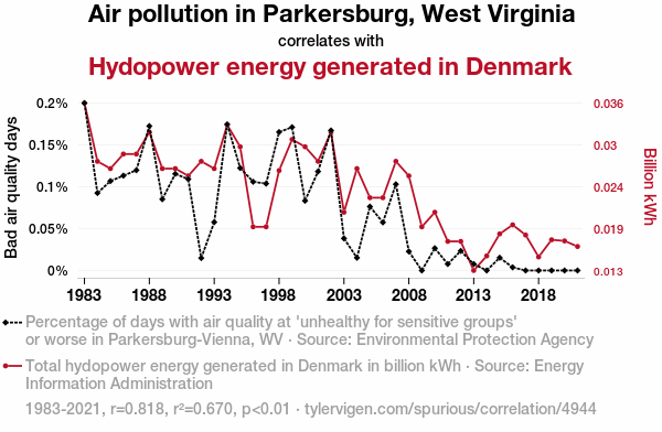 air pollution, Parkersburg, West Virginia, hydroelectric power, Denmark, correlation, statistical analysis, environmental data, Energy Information Administration, Environmental Protection Agency, correlation coefficient, p-value, interconnectedness, statistical surprises
