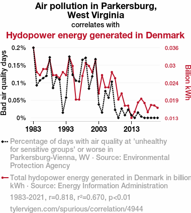 - The spurious research paper: A Breath of Fresh Data: Unraveling the Unlikely Link Between Air Pollution in Parkersburg, West Virginia, and Hydroelectric Power in Denmark