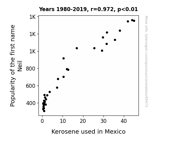 This means 94.5% of the change in the one variable (i.e., Kerosene used in Mexico) is predictable based on the change in the other (i.e., Popularity of the first name Neil) over the 40 years from 1980 through 2019.