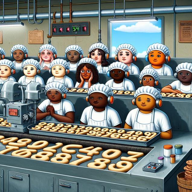 Prompt: [ Whimsical illustration ] In a cozy kitchen in Pennsylvania, a line of talented heat treating equipment setters and operators are hard at work. They are diligently shaping dough into numeral-shaped cookies for the Numberphile team. As the line dwindles, the Numberphile crew looks on with concern, anticipating fewer numeral-themed video titles in the future. The dwindling number of cookie makers reflects the decreasing number of heat treating equipment setters in Pennsylvania, impacting the nerdiness of the Numberphile videos. I hope this prompt inspires a whimsical illustration that captures the charm and concern in this scene, with colorful and imaginative portrayals of the cookie makers and the Numberphile crew in the cozy kitchen setting. The depiction should include only scenes, people, and objects, it should not include text or speech bubbles.