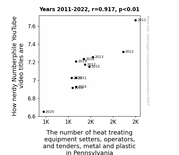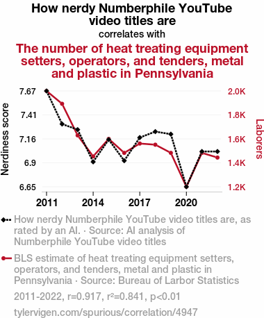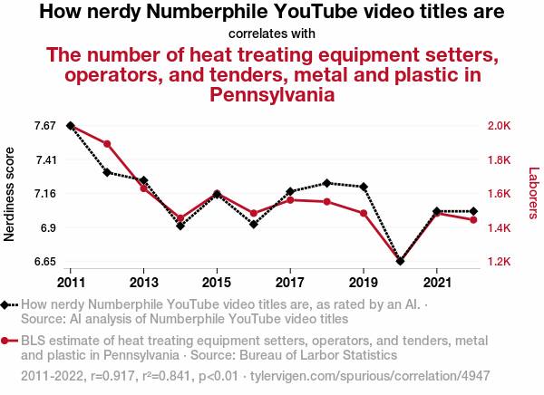 This means 84.1% of the change in the one variable (i.e., The number of heat treating equipment setters, operators, and tenders, metal and plastic in Pennsylvania) is predictable based on the change in the other (i.e., How nerdy Numberphile YouTube video titles are) over the 12 years from 2011 through 2022.