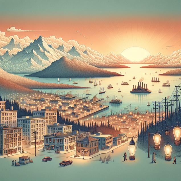 Prompt: Generate an image of a serene landscape featuring the city of Anchorage with crystal-clear air overhead. Show the transition as the high-pressure system travels to the U.S. Pacific Islands, where the islands are brightly illuminated with electric lights, replacing the need for kerosene lamps. This artwork should reflect a sense of clarity, brightness, and progress, representing the positive impact of improved air quality on the islands' lighting. The depiction should include only scenes, people, and objects, it should not include text or speech bubbles.