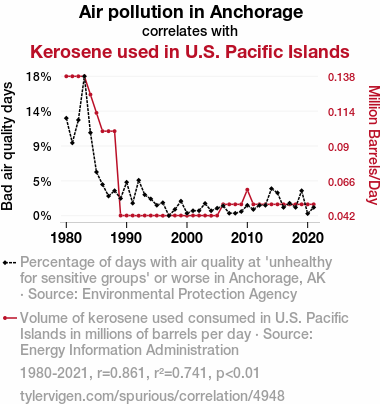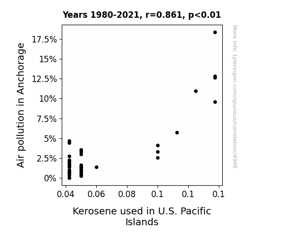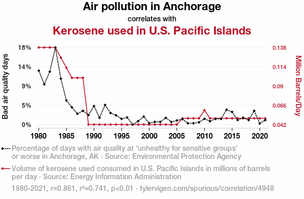 This means 74.1% of the change in the one variable (i.e., Kerosene used in U.S. Pacific Islands) is predictable based on the change in the other (i.e., Air pollution in Anchorage) over the 42 years from 1980 through 2021.