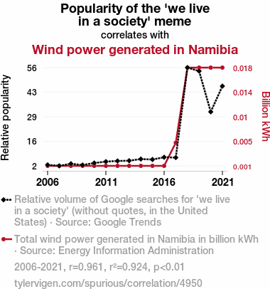 - The spurious research paper: We Live in a Current-Generating Society: The Shocking Connection Between 'We Live in a Society' Meme Popularity and Wind Power Generated in Namibia
