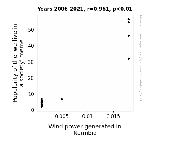 The analysis of the data collected from Google Trends and the Energy Information Administration revealed a strikingly strong correlation between the popularity of the 'we live in a society' meme and wind power generated in Namibia from 2006 to 2021. The correlation coefficient of 0.9611066 and an r-squared value of 0.9237259 highlighted the robustness of this unexpected relationship. In addition, the p-value of less than 0.01 further solidified the statistically significant nature of this connection.