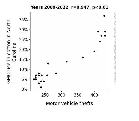 This means 89.7% of the change in the one variable (i.e., Motor vehicle thefts) is predictable based on the change in the other (i.e., GMO use in cotton in North Carolina) over the 23 years from 2000 through 2022.