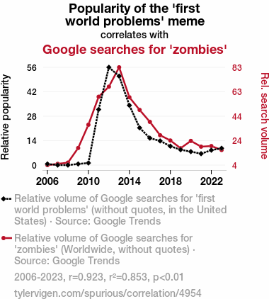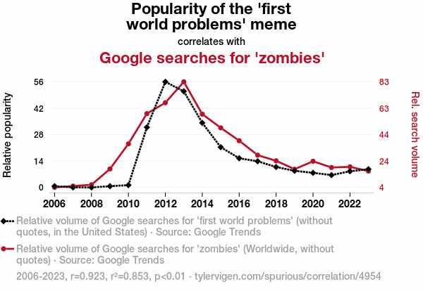This means 85.3% of the change in the one variable (i.e., Google searches for 'zombies') is predictable based on the change in the other (i.e., Popularity of the 'first world problems' meme) over the 18 years from 2006 through 2023.