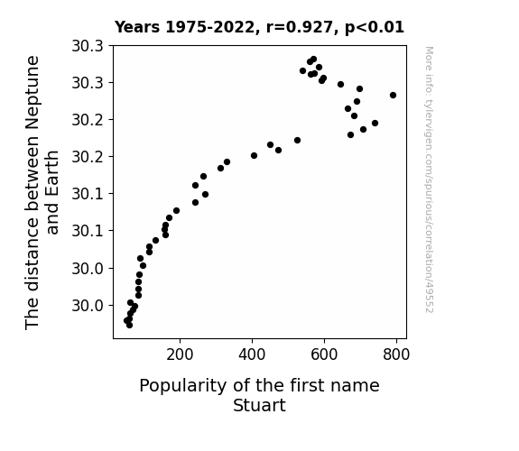 This means 85.9% of the change in the one variable (i.e., Popularity of the first name Stuart) is predictable based on the change in the other (i.e., The distance between Neptune and Earth) over the 48 years from 1975 through 2022.