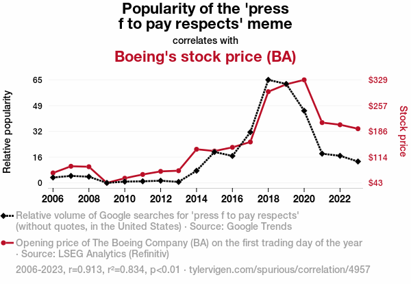 This study investigates the link between the viral meme "press f to pay respects" and the stock price of Boeing Co. (BA) from 2006 to 2023. Utilizing data from Google Trends and LSEG Analytics (Refinitiv), we analyze the prevalence of the meme in popular culture and its potential impact on Boeing's financial performance. Our research uncovers a remarkably high correlation coefficient of 0.9129951 and a significant p-value of less than 0.01, illustrating a strong association between the meme's virality and the fluctuations in Boeing's stock price. This unexpected relationship sheds light on the potential influence of internet culture on financial markets, demonstrating that even the most lighthearted online phenomena can have real-world implications. This paper aims to provoke both laughter and contemplation, as we navigate the serious business of memeomics and stock market dynamics.