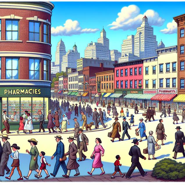 Prompt: [ An image that looks like it is a scene from a Pixar movie ] A bustling city scene with a picturesque clear blue sky over Worcester, Massachusetts. People are seen leisurely strolling through the streets, enjoying the clean, fresh air and smiling. In the backdrop, bustling pharmacies are depicted with staff hurrying to attend to the increased demand, portraying a vibrant but organized chaos. The depiction should include only scenes, people, and objects, it should not include text or speech bubbles.