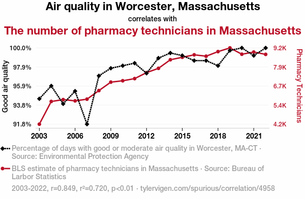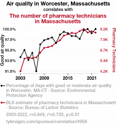 - The spurious research paper: A Breath of Fresh Data: Examining the Relationship Between Air Quality in Worcester, Massachusetts, and the Dispensing of Pharmacy Technicians in Massachusetts