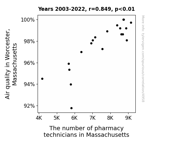 This means 72% of the change in the one variable (i.e., The number of pharmacy technicians in Massachusetts) is predictable based on the change in the other (i.e., Air quality in Worcester, Massachusetts) over the 20 years from 2003 through 2022.