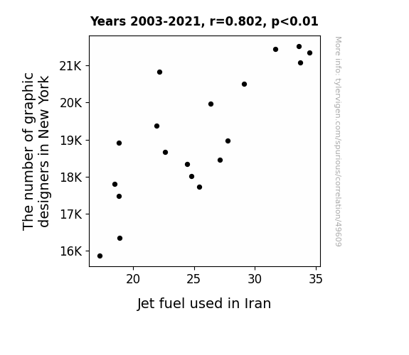 This means 64.3% of the change in the one variable (i.e., Jet fuel used in Iran) is predictable based on the change in the other (i.e., The number of graphic designers in New York) over the 19 years from 2003 through 2021.