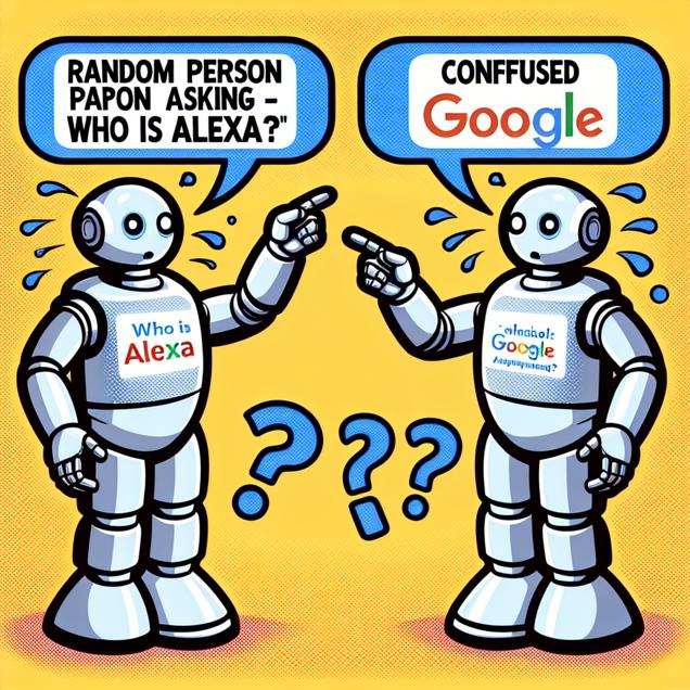 Create a meme inspired by the spiderman pointing meme that in some way references Google searches for 'who is alexa'. Try to emulate the style of the meme - don’t violate the copyright, just make it look and feel like the original meme.