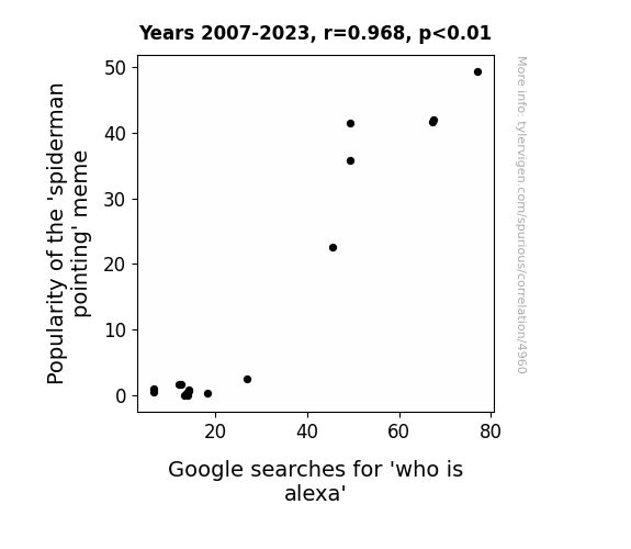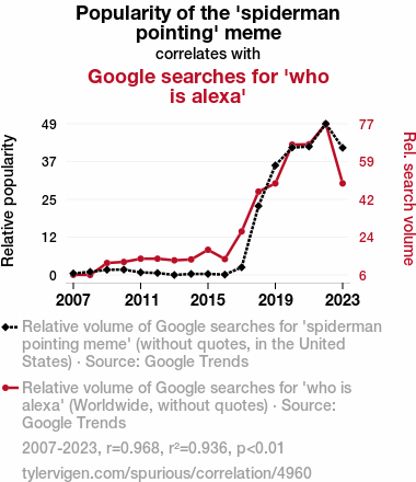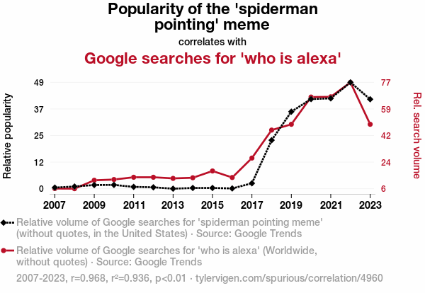 spiderman pointing meme, Google searches, who is alexa, internet culture, memes, Google Trends, correlation coefficient, statistical significance, internet humor, search queries, digital assistant, viral memes, online inquiries, internet phenomena, meme culture, cyber realm