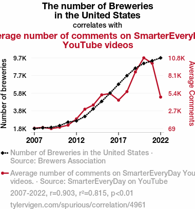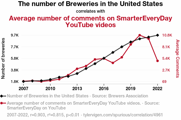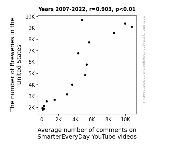 This means 81.5% of the change in the one variable (i.e., Average number of comments on SmarterEveryDay YouTube videos) is predictable based on the change in the other (i.e., The number of Breweries in the United States) over the 16 years from 2007 through 2022.