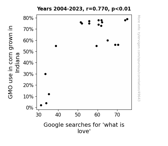 This means 59.3% of the change in the one variable (i.e., Google searches for 'what is love') is predictable based on the change in the other (i.e., GMO use in corn grown in Indiana) over the 20 years from 2004 through 2023.