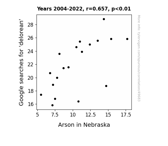 This means 43.1% of the change in the one variable (i.e., Arson in Nebraska) is predictable based on the change in the other (i.e., Google searches for 'delorean') over the 19 years from 2004 through 2022.