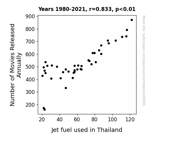 This means 69.3% of the change in the one variable (i.e., Jet fuel used in Thailand) is predictable based on the change in the other (i.e., Number of Movies Released Annually) over the 42 years from 1980 through 2021.