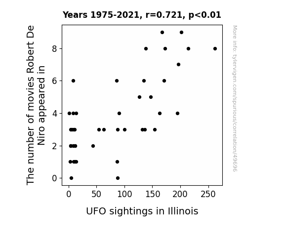 This means 52% of the change in the one variable (i.e., UFO sightings in Illinois) is predictable based on the change in the other (i.e., The number of movies Robert De Niro appeared in) over the 47 years from 1975 through 2021.