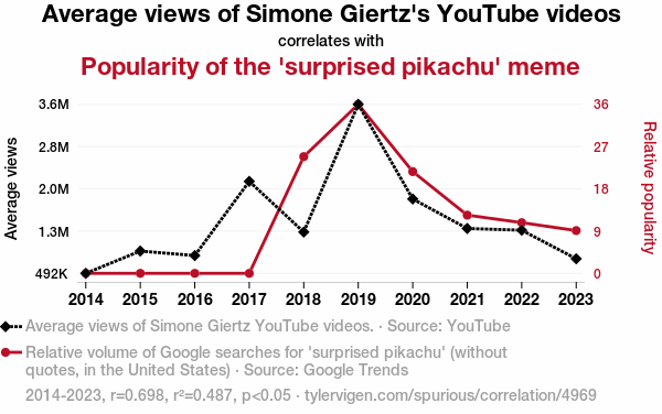 Simone Giertz, YouTube views, Surprised Pikachu meme, correlation, YouTube data analysis, Google Trends, meme popularity, internet culture, meme propagation, comedic ingenuity, online content creation, internet trends, statistical analysis