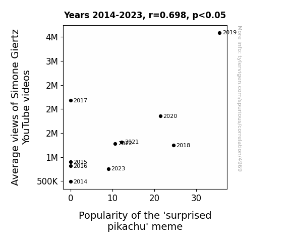 The robust association between the average views of Giertz's videos and the prominence of the 'Surprised Pikachu' meme suggests that the comedic ingenuity displayed in her videos may have contributed to the enduring popularity of the meme. It appears that the shared elements of humor and surprise have formed an unexpectedly synergistic partnership between Giertz's content and the 'Surprised Pikachu' meme. This unanticipated correlation challenges traditional views on the distinct domains of online content creation and meme proliferation, underscoring the multifaceted nature of internet culture.