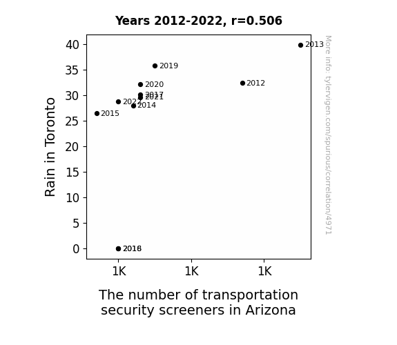 This means 25.6% of the change in the one variable (i.e., The number of transportation security screeners in Arizona) is predictable based on the change in the other (i.e., Rain in Toronto) over the 11 years from 2012 through 2022.