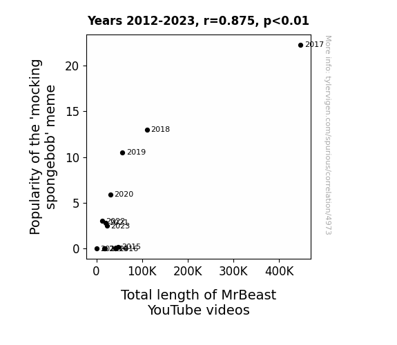 - The spurious research paper: Mocking Memes and Monetized Minutes: The Correlation between the Popularity of the 'Mocking Spongebob' Meme and the Total Length of MrBeast YouTube Videos