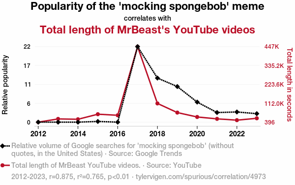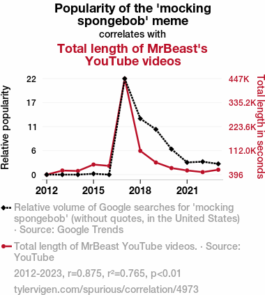 - The spurious research paper: Mocking Memes and Monetized Minutes: The Correlation between the Popularity of the 'Mocking Spongebob' Meme and the Total Length of MrBeast YouTube Videos