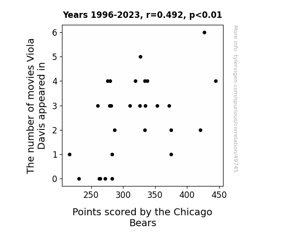 This means 24.2% of the change in the one variable (i.e., Points scored by the Chicago Bears) is predictable based on the change in the other (i.e., The number of movies Viola Davis appeared in) over the 28 years from 1996 through 2023.