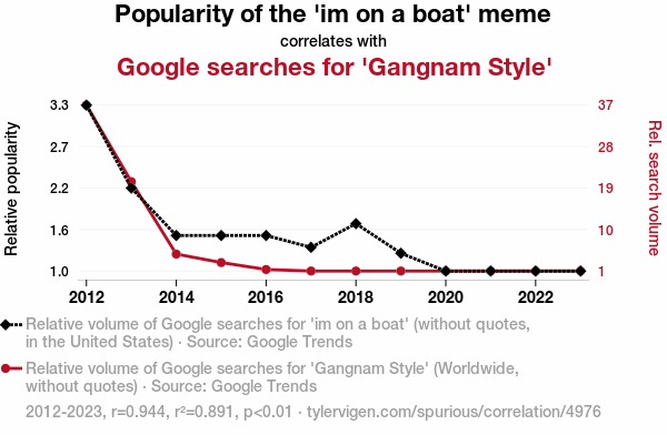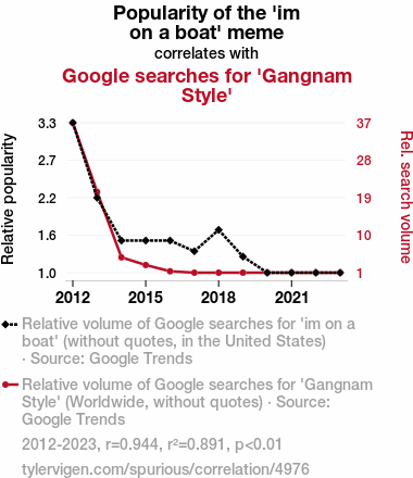 This means 89.1% of the change in the one variable (i.e., Google searches for 'Gangnam Style') is predictable based on the change in the other (i.e., Popularity of the 'im on a boat' meme) over the 12 years from 2012 through 2023.