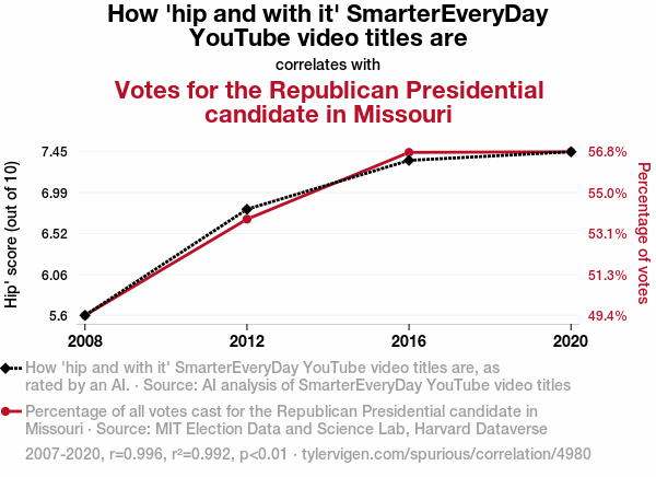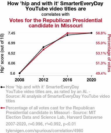 User prompt: Please make up a funny explanation for how an increase in How 'hip and with it' SmarterEveryDay YouTube video titles are caused Votes for the Republican Presidential candidate in Missouri to increase. Make it feel plausible.