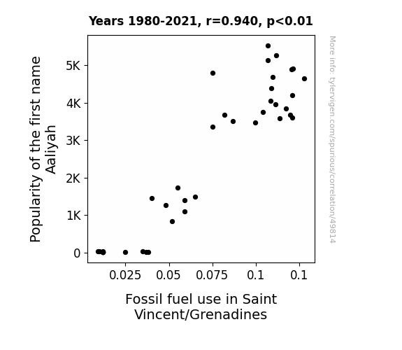 This means 88.3% of the change in the one variable (i.e., Fossil fuel use in Saint Vincent/Grenadines) is predictable based on the change in the other (i.e., Popularity of the first name Aaliyah) over the 42 years from 1980 through 2021.