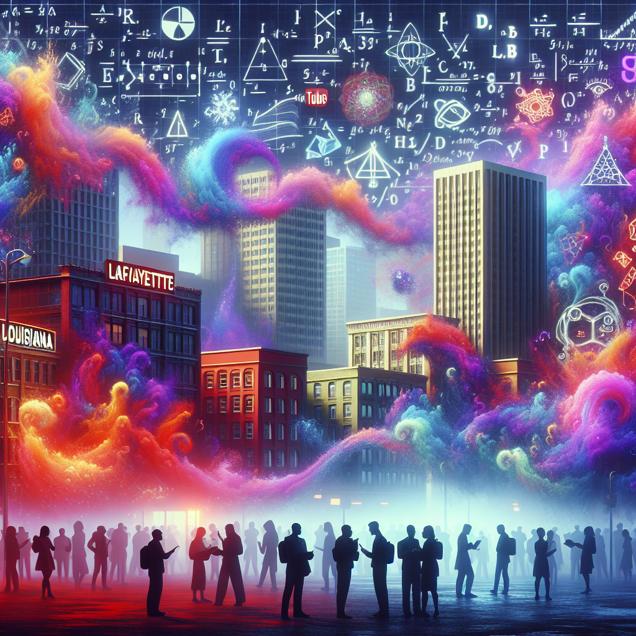 User prompt: Please describe a visual scene that prominently depicts both Air pollution in Lafayette, Louisiana and Average number of comments on Vihart YouTube videos, in the following situation: The smog in the air was creating intricate patterns that mirrored the mathematical beauty Vihart explores, sparking a surge in discussions about her content. With each breath of polluted air, viewers found themselves strangely compelled to engage in lively mathematical debates in the comment section. The correlation between air pollution in Lafayette, Louisiana and the average number of comments on Vihart YouTube videos can only be explained by this bizarre, pollution-induced mathematical enthusiasm.. Keep the description simple.