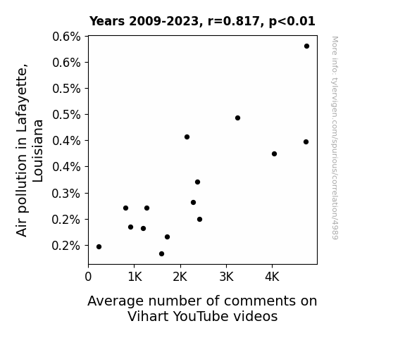 User prompt: Please make up a funny explanation for how increases in Air pollution in Lafayette, Louisiana positively influenced Average number of comments on Vihart YouTube videos.