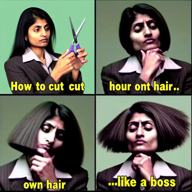 Create a meme inspired by the like a boss meme that in some way references Google searches for 'how to cut own hair'. Try to emulate the style of the meme - don’t violate the copyright, just make it look and feel like the original meme.