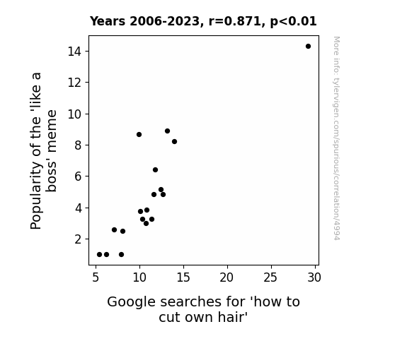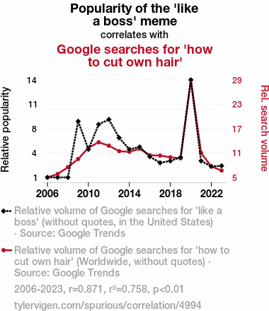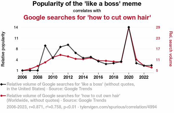 This means 75.8% of the change in the one variable (i.e., Google searches for 'how to cut own hair') is predictable based on the change in the other (i.e., Popularity of the 'like a boss' meme) over the 18 years from 2006 through 2023.